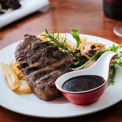 Scotch fillet, chips and salad with a glass of house wine / pot of beer / soft drink Add sauce or Topping: Creamy mushroom / Pepper / Beef jus /Garlic butter $2.5 Bacon and egg $4 Garlic prawns $8
