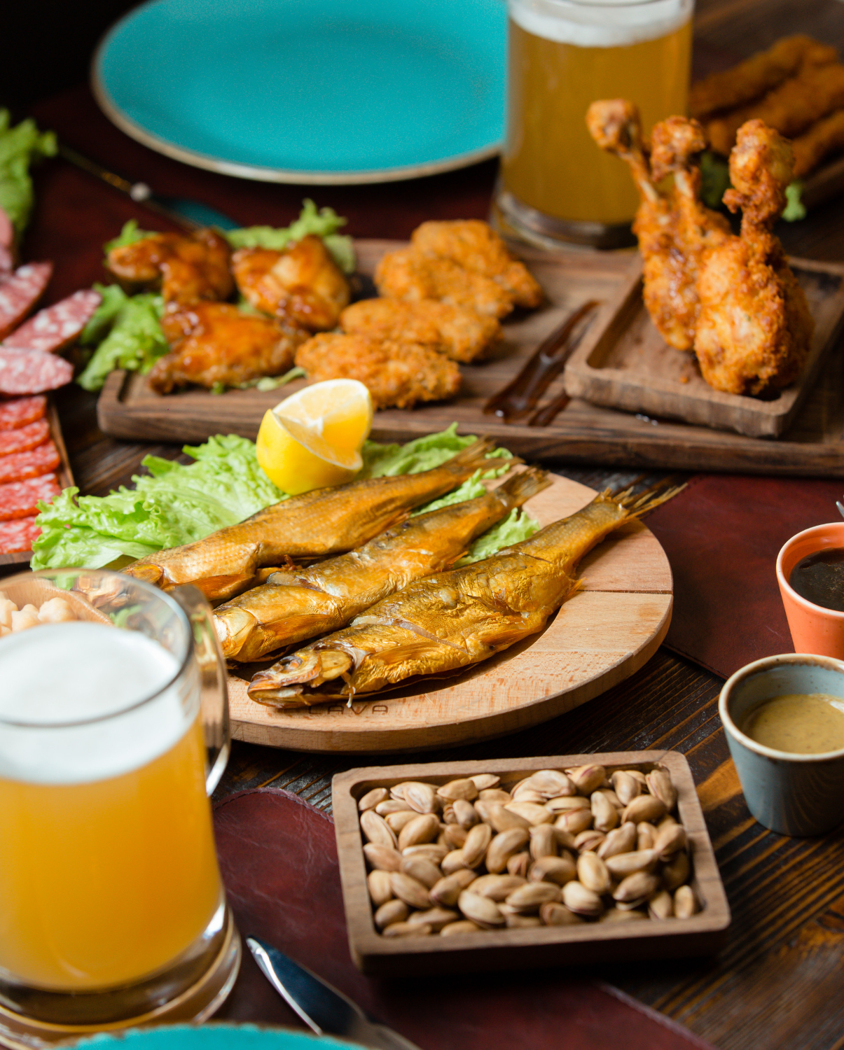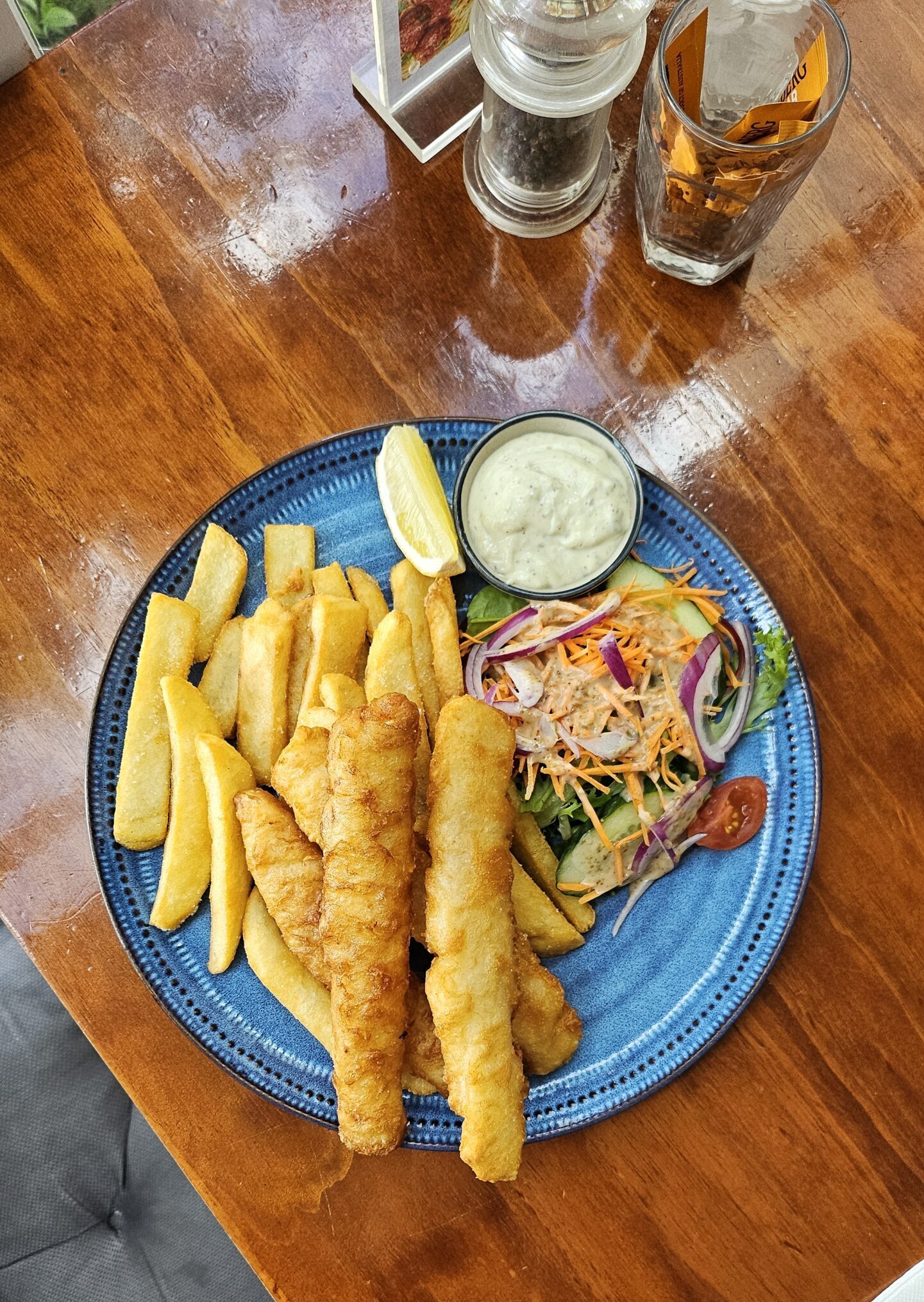 FISH AND CHIPS, SALAD, TOMATO SAUCE