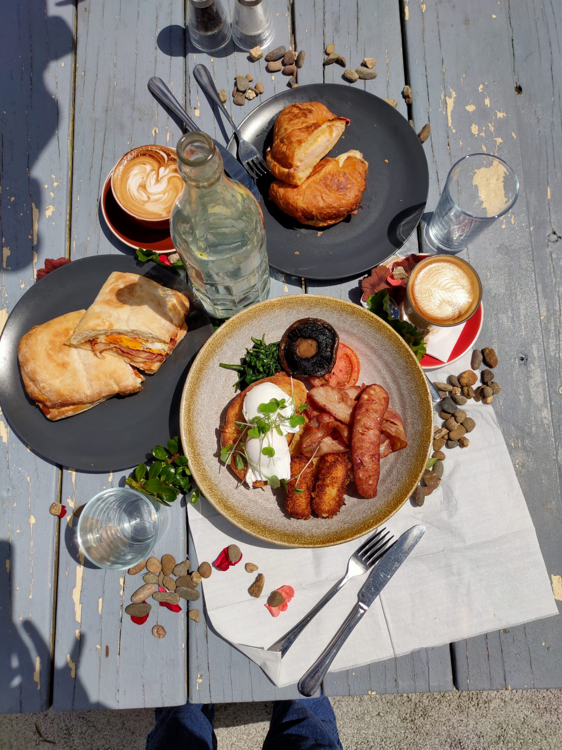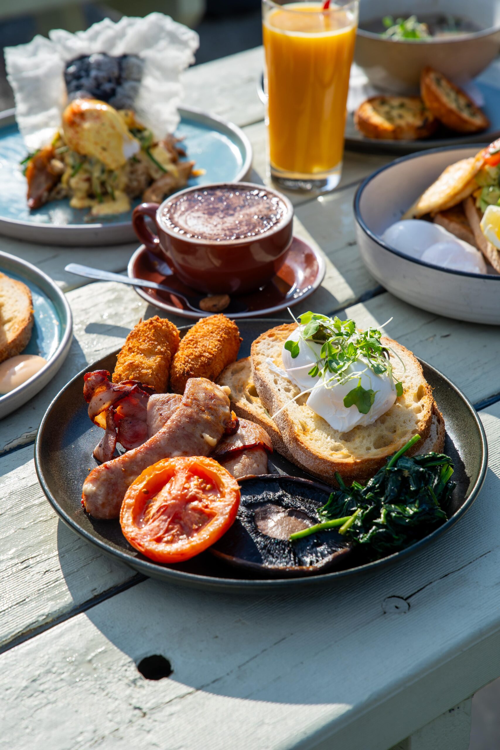 Eggs Of Your Choice, Bacon, Sausage, Mushroom, Spinach, Croquette, Tomato On Toasted Sourdough