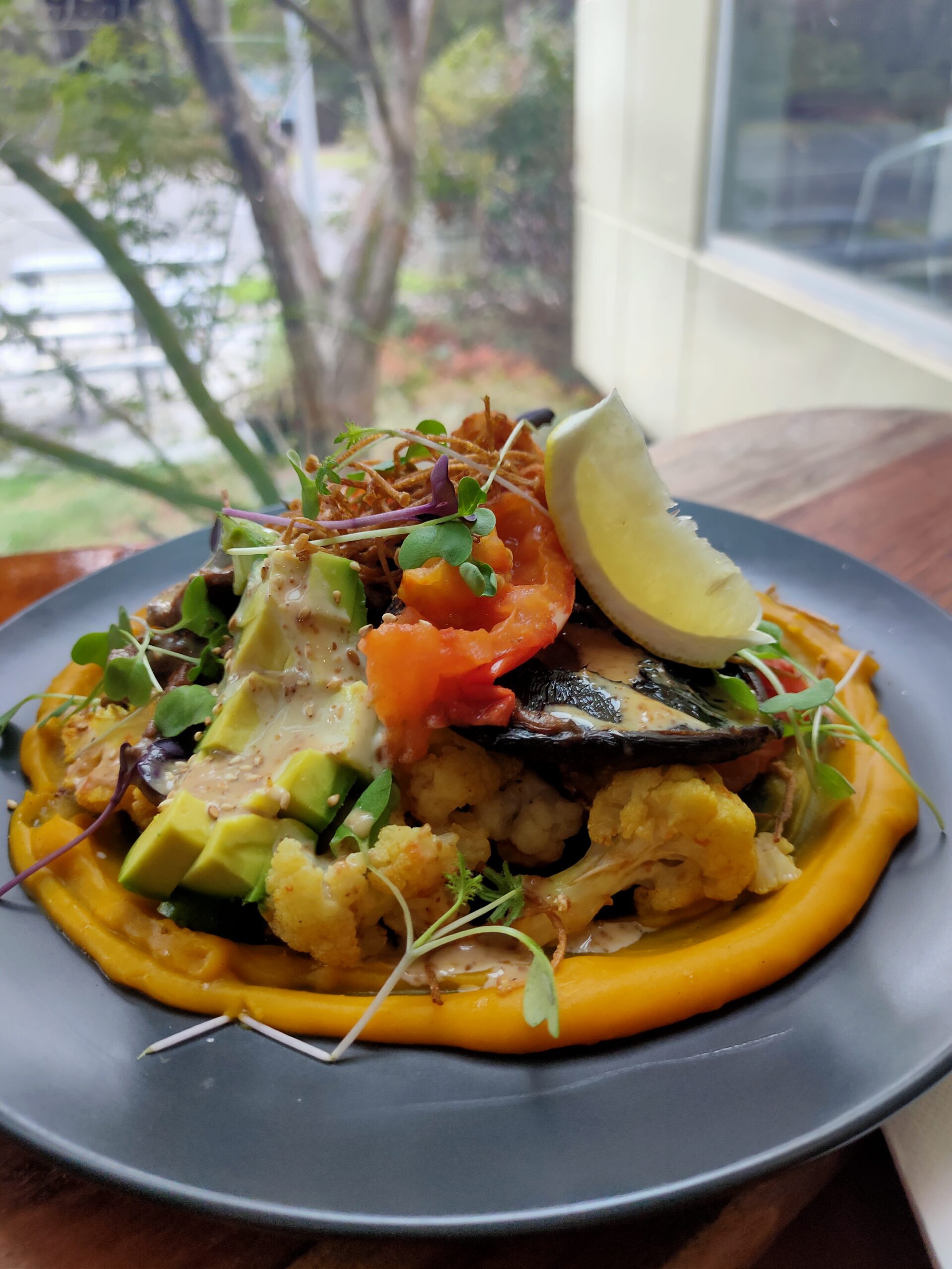 Roasted Spiced Cauliflower, Field Mushroom, Tomato, Avocado, Fried Cheese Sticks, Enoki, Pumpkin Puree, Sesame Soy Dressing